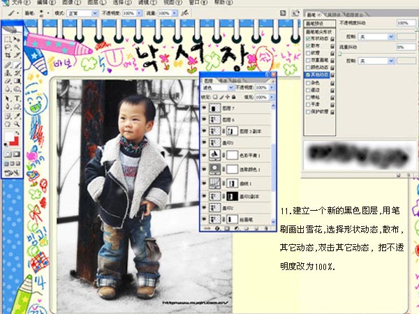 第11步:建立一个新的黑色图层,用笔刷画出雪花,选择形状动态,散布,其他动态,双击其它动态,把不透明度改为100%。