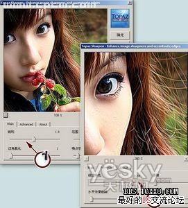 在安装了TOPAZ外挂滤镜之后,我们打开一张图片,使用菜单“滤镜→TopazVivacity→Topaz Sharpen”,在Main选项卡中,设置锐利值为“1.9”。