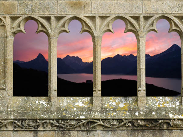 7、我们可以看到风景照片的色调主要是紫色,所以我们的调整石柱的颜色。使用色相/饱和度、色阶等调整工具来调整石柱的颜色。